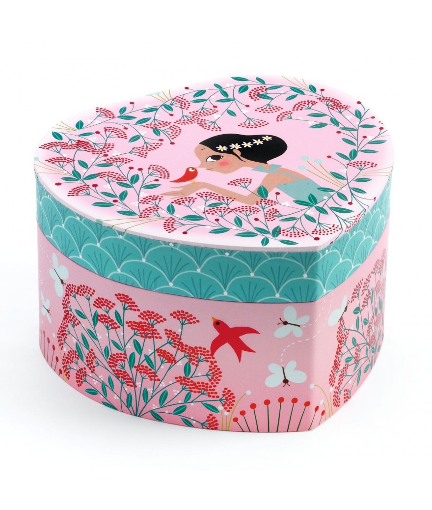 Dit doosje met lenteachtige melodie is een prachtig geïllustreerd hartvormige muziekdoos om juwelen en geheimen in op te bergen. Draai aan de zwengel, open de doos, en verrassing! Een mooi gebeeldhouwde danseres draait en wordt weerspiegeld in een spiegel op de muziek van Carl Maria von Weber's "Invitation to the Dance".