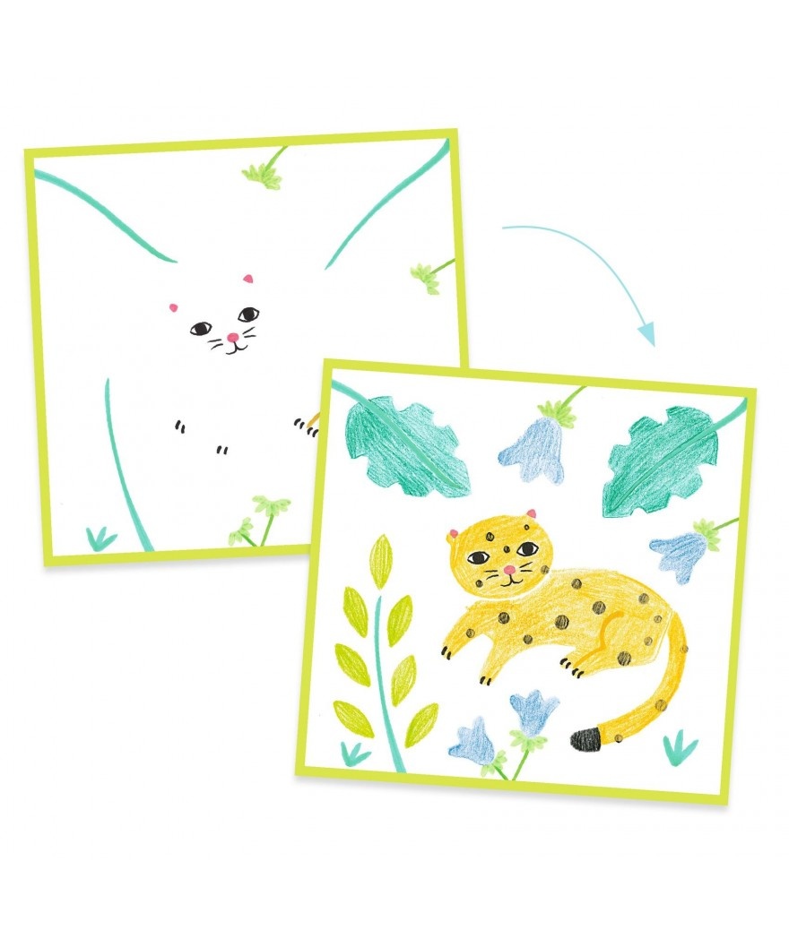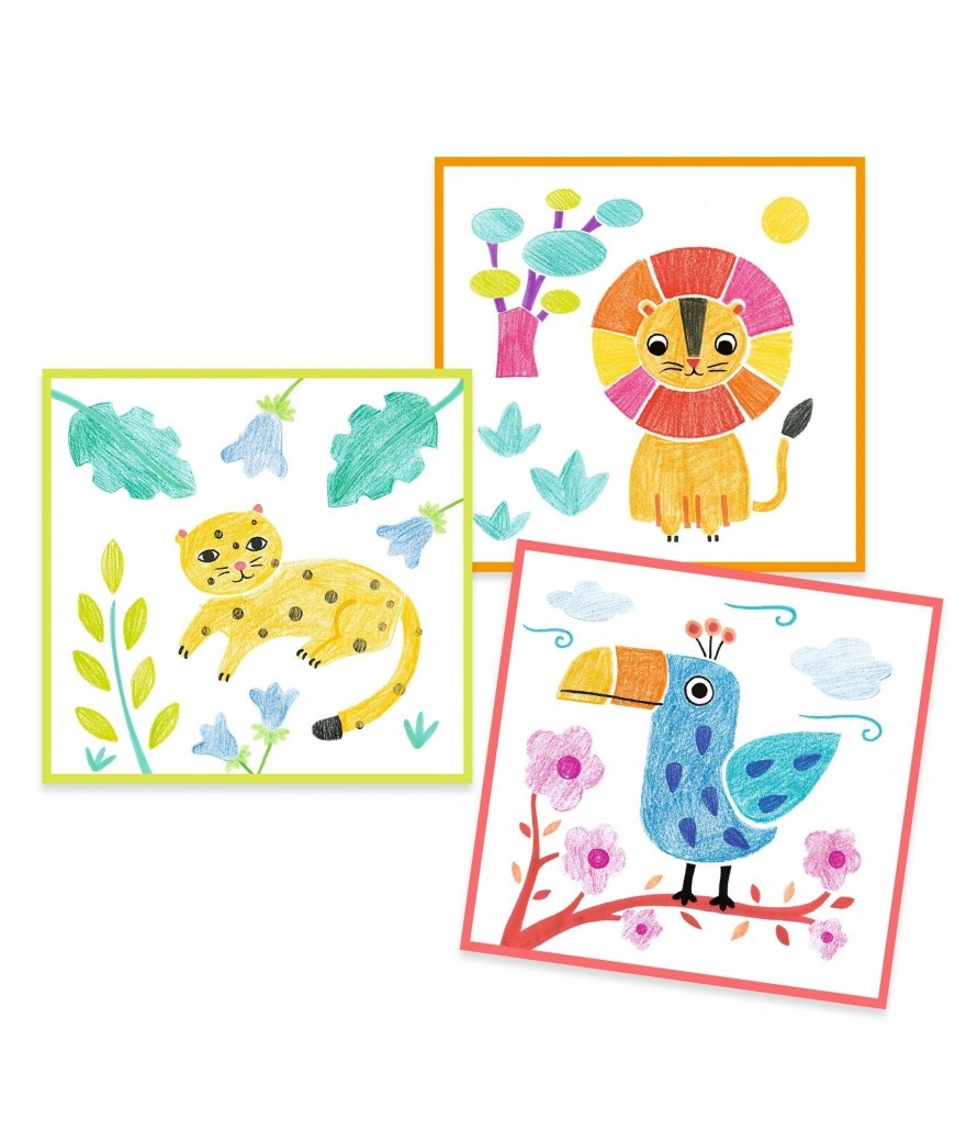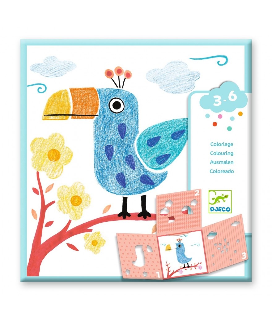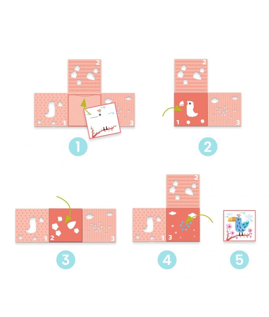 Het kind creëert zijn/haar eigen schilderij met behulp van een uitgesneden sjabloon met 3 kleppen. Hij/zij schuift een vel in het sjabloon en klapt vervolgens het eerste sjabloon toe. Hij/zij kleurt de prent in. Hij/zij opent de klep opnieuw en herhaalt deze stappen voor de tweede en de derde klep. Het resultaat: een prachtig kunstwerk!