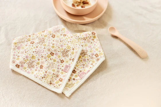 Deze schattige bandana slabbetjes uit de Flower Fairies collectie zijn heerlijk praktisch! Het setje bevat twee slabbetjes met een vrolijke bloemenprint in zachte, frisse kleuren. Dankzij de drukknoopjes blijven ze goed zitten en bieden ze optimaal comfort voor je kleintje. De zachte stof is perfect voor het tere huidje en neemt goed vocht op, waardoor ze ideaal zijn voor elke maaltijd samen!