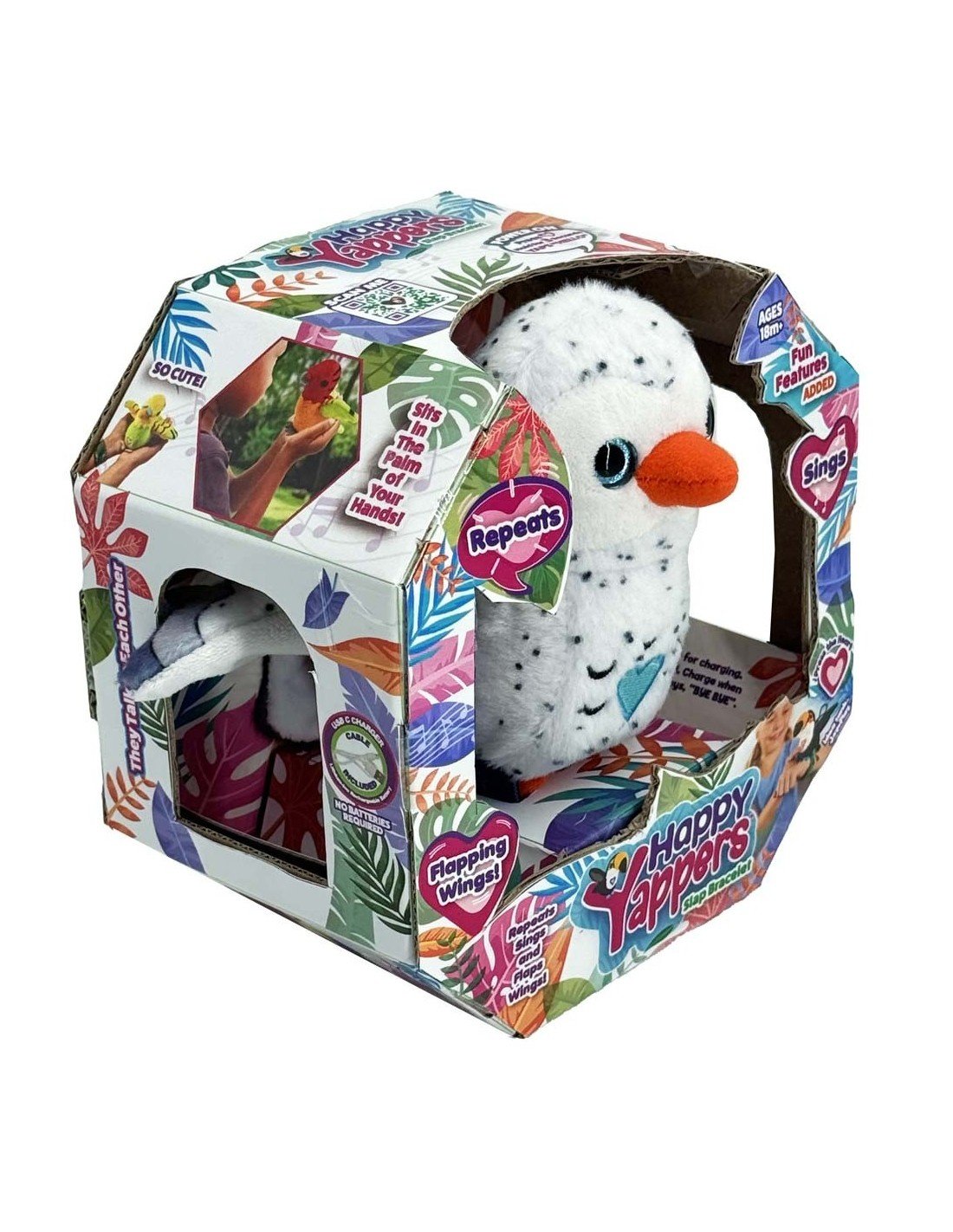 Beleef interactief spel zoals nooit tevoren met Happy Yappers! Deze schattige pluchen vogeltjes herhalen gesproken woorden en geluiden, zingen het vrolijke Happy Yappers liedje (Rock 'n' Robin) en fladderen met hun vleugels. Gemaakt van hoogwaardig zacht polyester en te dragen als klaparmband. De Happy Yappers zijn de ideale metgezel voor kinderen. USB-C oplaadbaar en goedgekeurd vanaf 18 maanden en natuurlijk veel ouder!