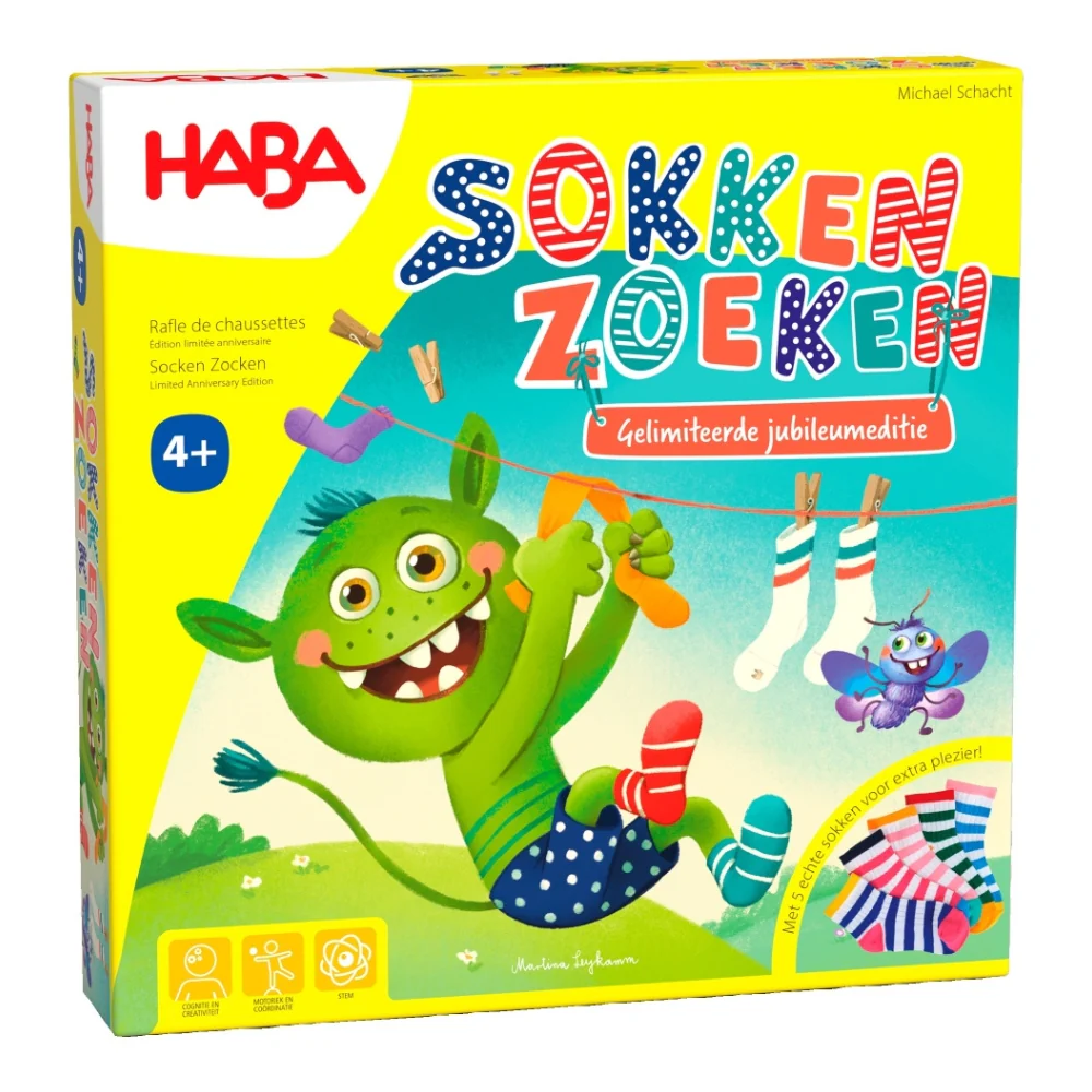 Het sokkenmonster heeft een enorme stapel sokken achtergelaten! Alle kinderen rommelen tegelijk door de stapel sokken, op zoek naar de bijpassende paren sokken. Maar wat is er gebeurd? Gaten in de sokken! Als dat niet de kleine mot met de grote eetlust was. De kinderen moeten oppassen dat ze niet te veel sokken met gaten krijgen. Voor wat extra uitdaging kunnen de kinderen de bijgevoegde sokken over hun handen doen! Wie aan het eind de meeste paren sokken te pakken heeft, wint het spel.