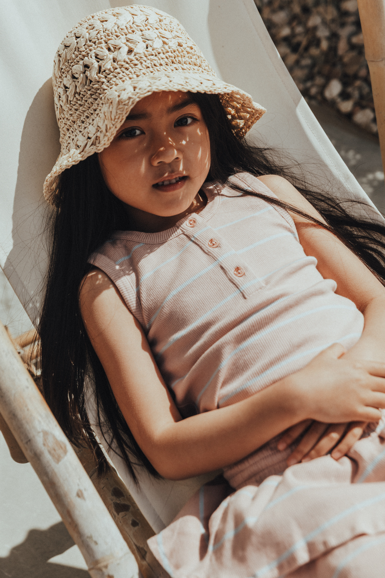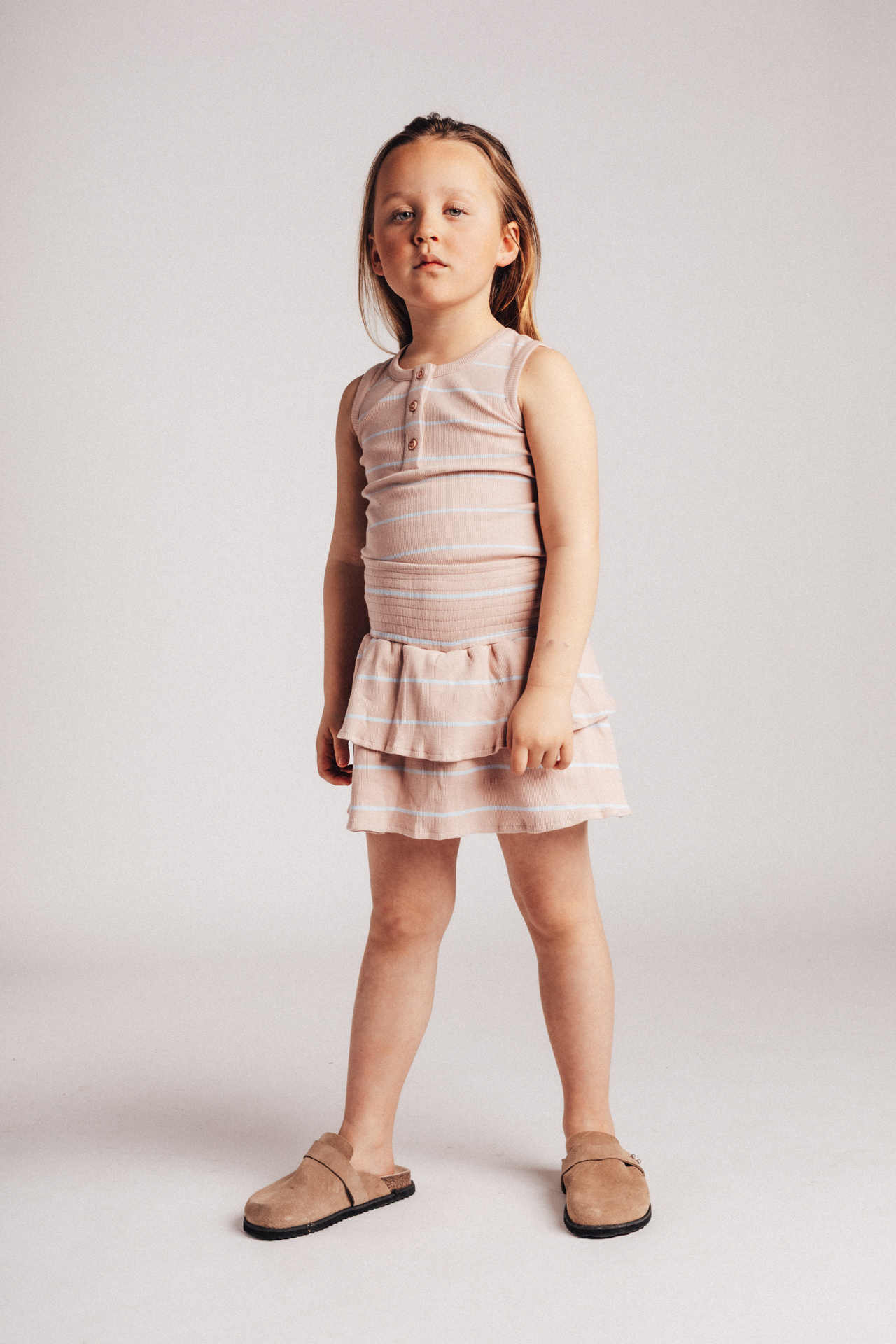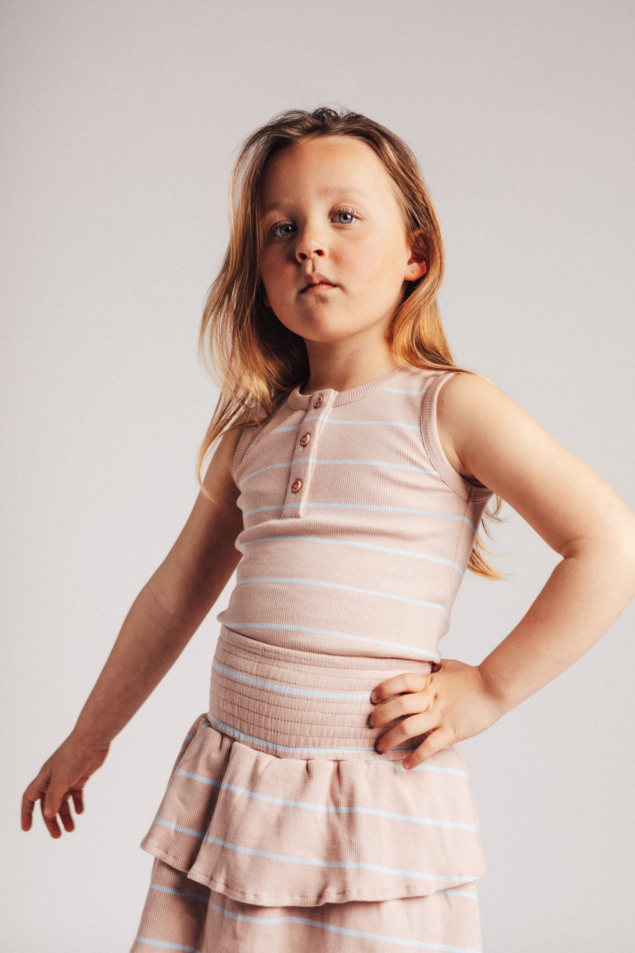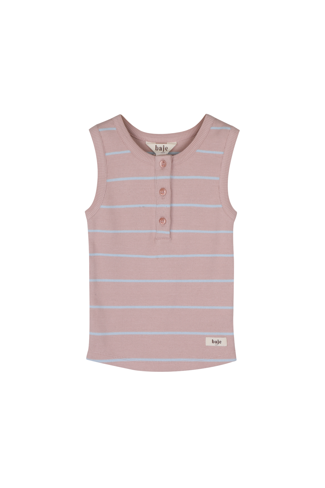 ProductomschrijvingFijne rib top met subtiele streep. De mouwloze pasvorm en knoopdetail aan de hals geven een tijdloze, zomerse uitstraling. Zacht, stretchy en perfect voor elke dag. Materiaal: 52% organisch katoen, 40% modal, 8% elastaan