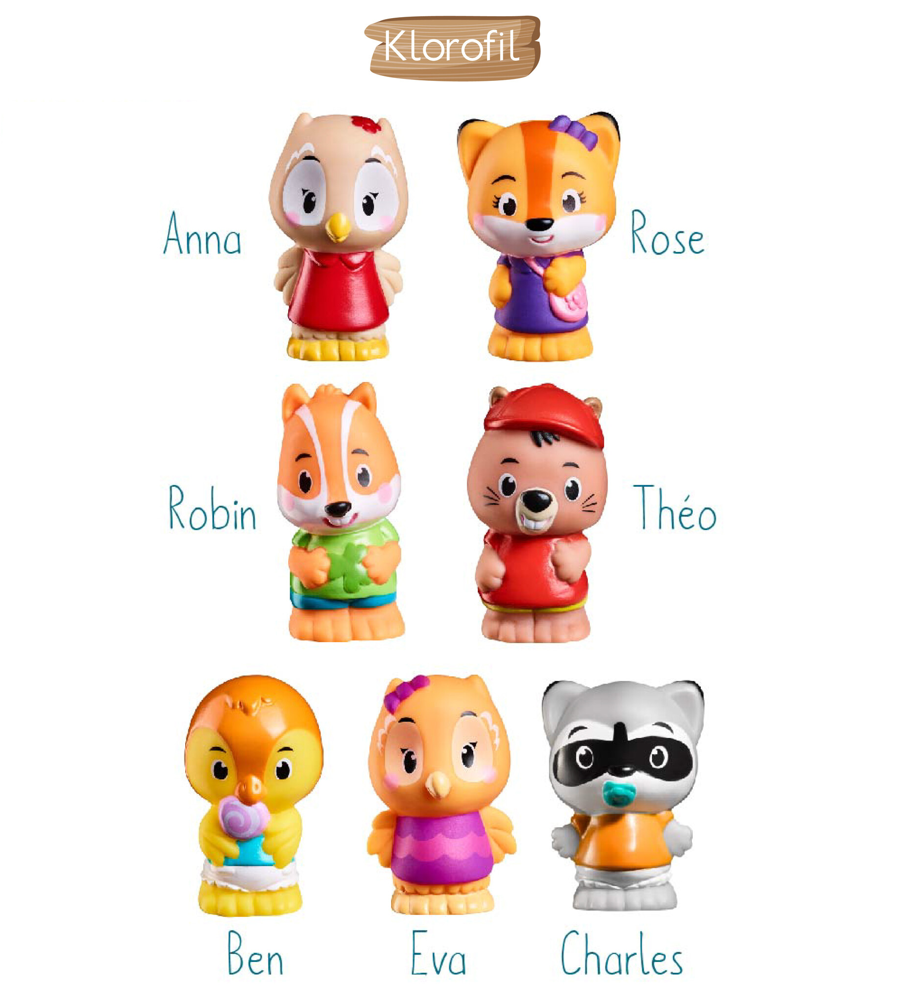 Een set met zeven Klorofil characters uit verschillende families: Anne, Rose, Ben Theo, Eva, Charles en Robin!
