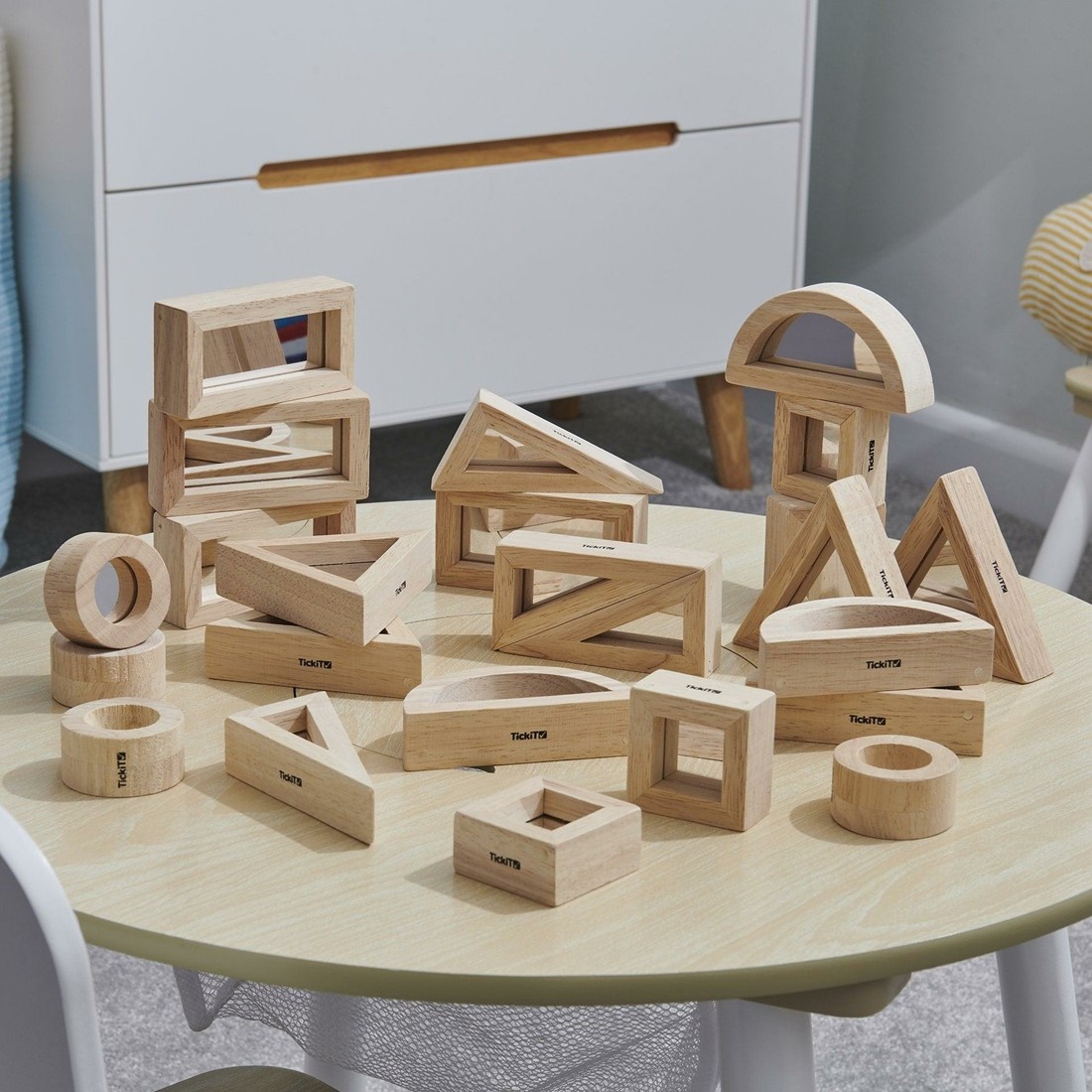 Tickit Spiegelblokken zijn verschillende rubberhouten vormen met een dubbelzijdig acryl spiegelcentrum. Glad en tastbaar, uw kind zal genieten van het verkennen van zijn reflectie, gefascineerd zijn door het licht dat wordt gereflecteerd vanaf het spiegelende oppervlak en genieten van eenvoudig blokken bouwen. Ideaal om vormen en reflecterende patronen te leren en prachtig te gebruiken met een lichtpaneel.