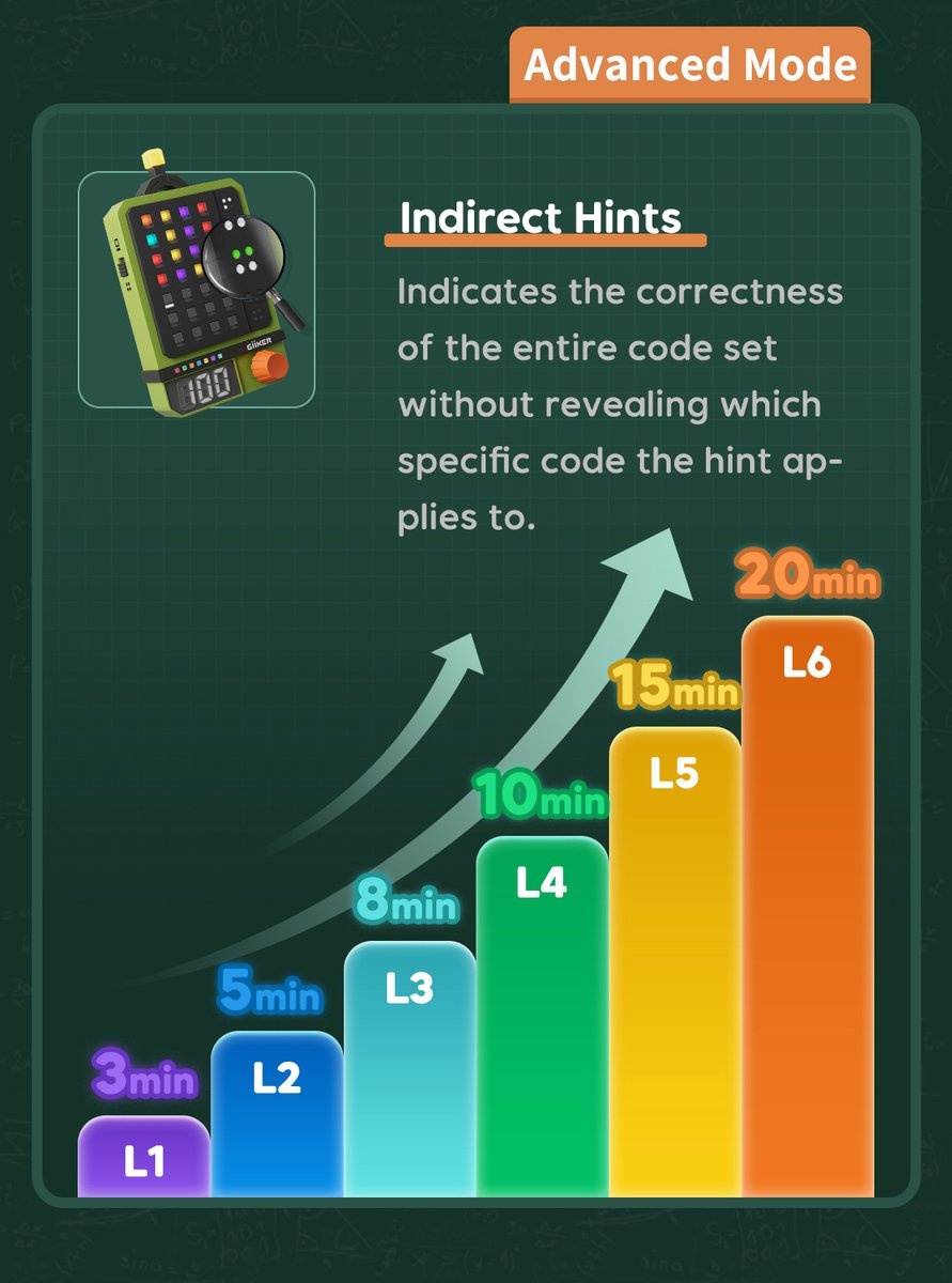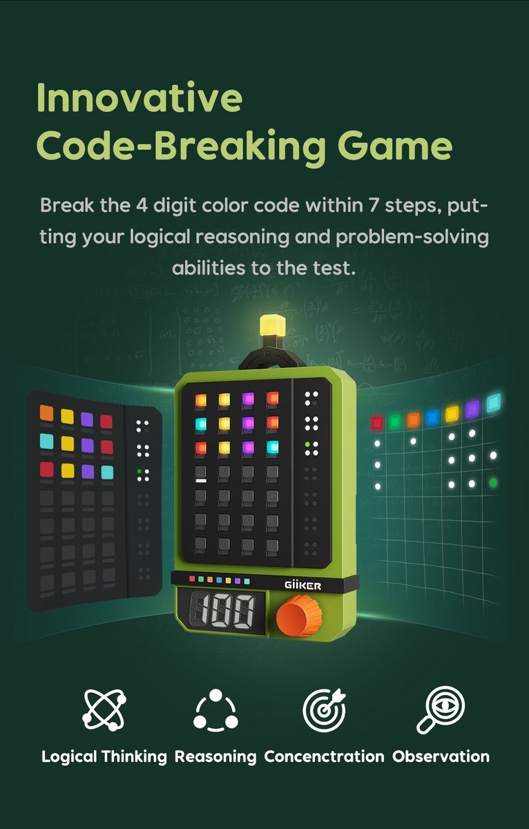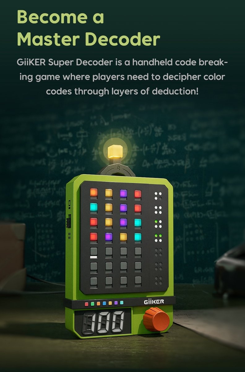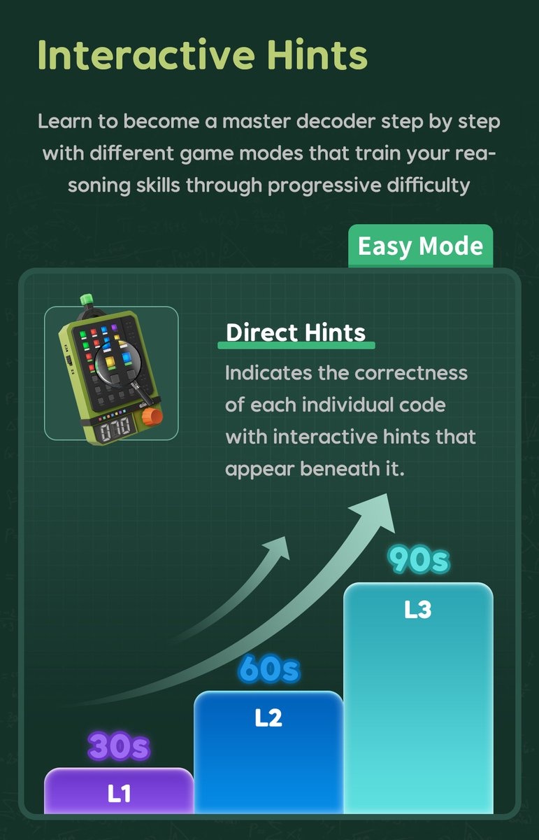 De Super Decoder is een compact denkspel waarin je een viercijferige kleurencode probeert te ontcijferen in maximaal 7 zetten. Met 600 niveaus, variërend van eenvoudig tot uitdagend, is uren puzzelplezier gegarandeerd.