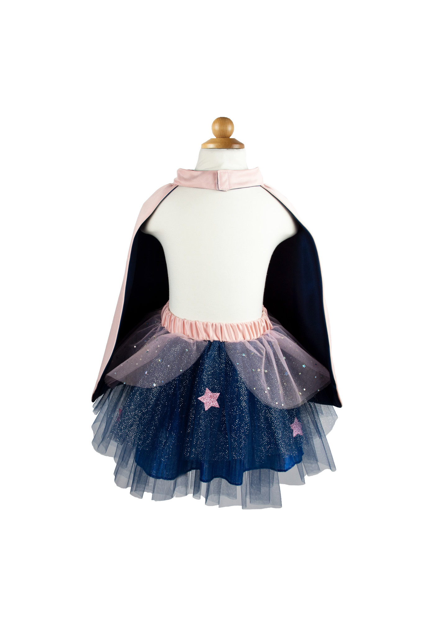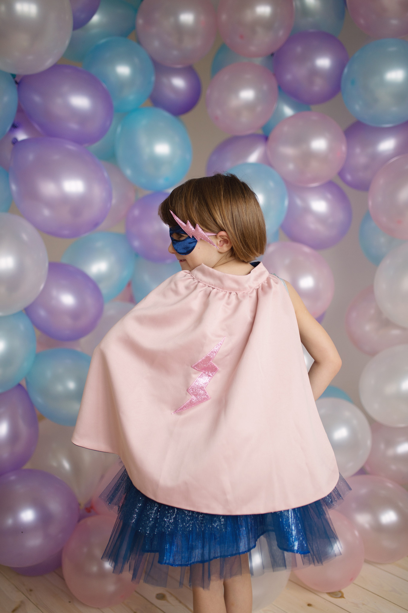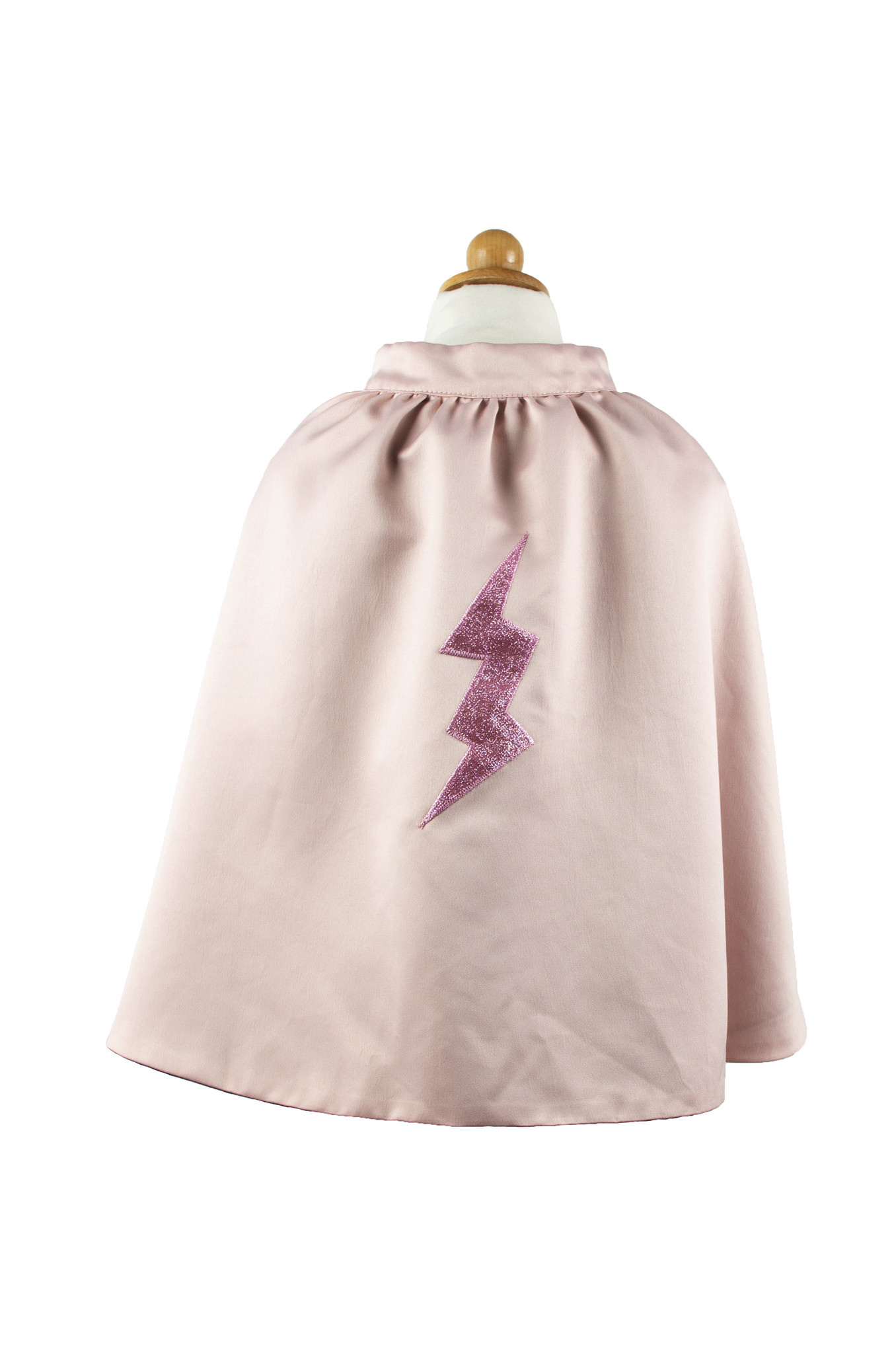 Transformeer met deze bliksemschichtcape en ontketen je superkrachten! Rockster of held, serieus, de sky is the limit. Driedelige set bestaande uit een gevoerde cape, dubbelzijdig masker en rok van glittertule, allemaal comfortabel en uiteraard wasbaar in de machine.
