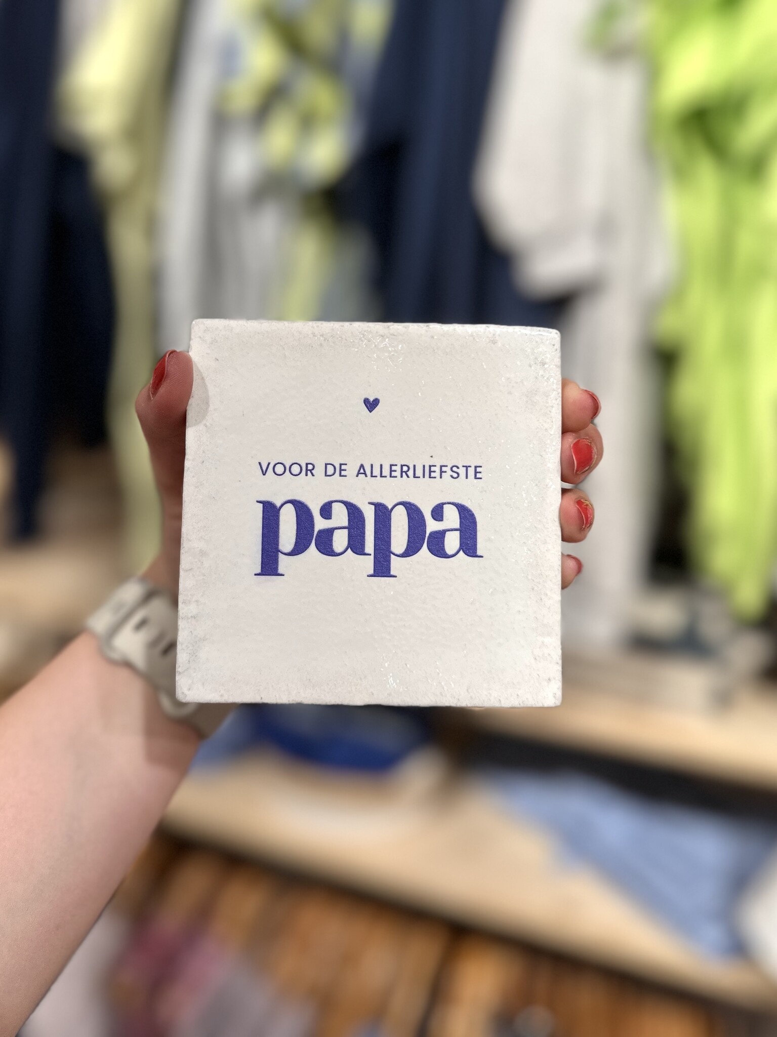 Verras jouw papa of opa met dit leuke tegeltje – een origineel cadeautje dat zeker in de smaak valt! Verkrijgbaar in verschillende kleuren en uitvoeringen. Dankzij het onzichtbare haakje aan de achterkant kun je het tegeltje zowel ophangen als neerzetten.