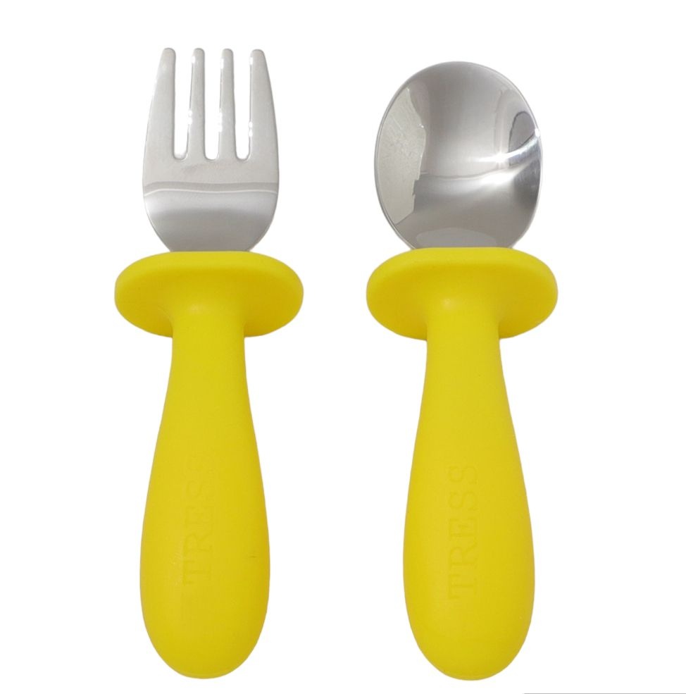 Lepel en vork van 60% siliconen en 40% roestvrijstaal in de kleur smile yellow.