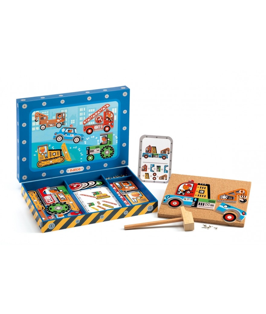 Een klassieke kleuterschoolactiviteit die door Djeco werd heruitgevonden om de behendigheid van jonge kinderen te ontwikkelen. Je kind bouwt zijn of haar eigen auto's en vrachtwagens door de stukken op de basis van kurk te leggen en ze vast te maken met de kleine spijkertjes en de hamer. Hij of zij maakt de modellen na of gebruikt de verbeelding om eigen voertuigen te creëren tot in het oneindige! Dit alles in een mooie houten doos!