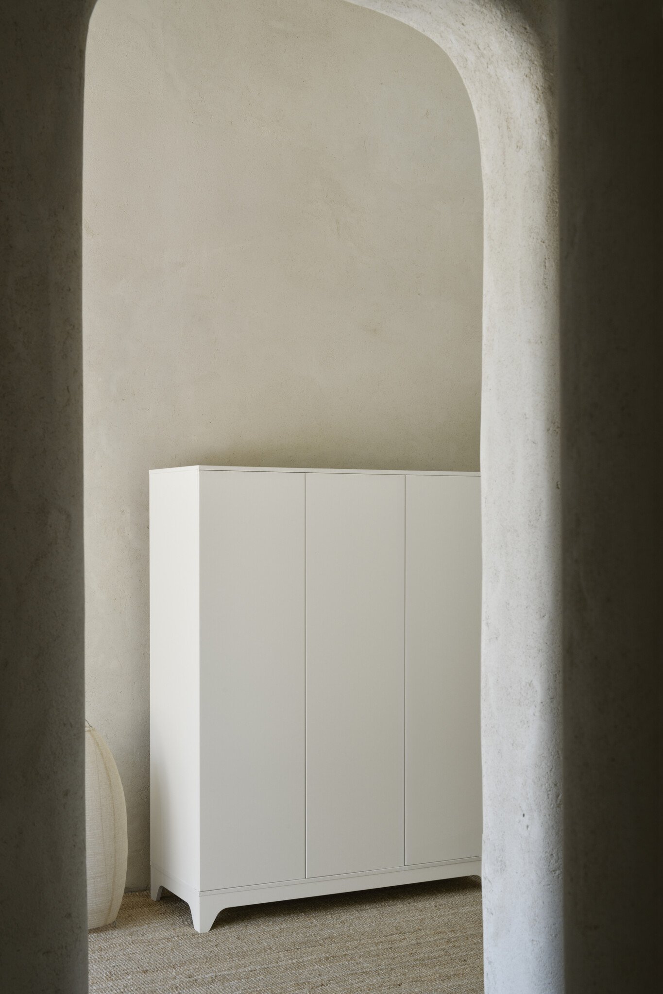 Het minimalistische ontwerp met afgeronde vormen zorgt ervoor dat de kast niet zwaar oogt, ondanks zijn formaat. Hierdoor blijft de kamer licht en harmonieus, terwijl je wel profiteert van veel opbergruimte.