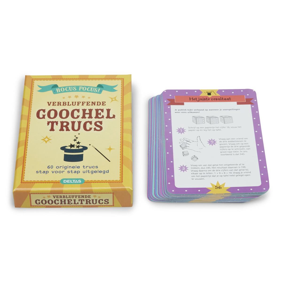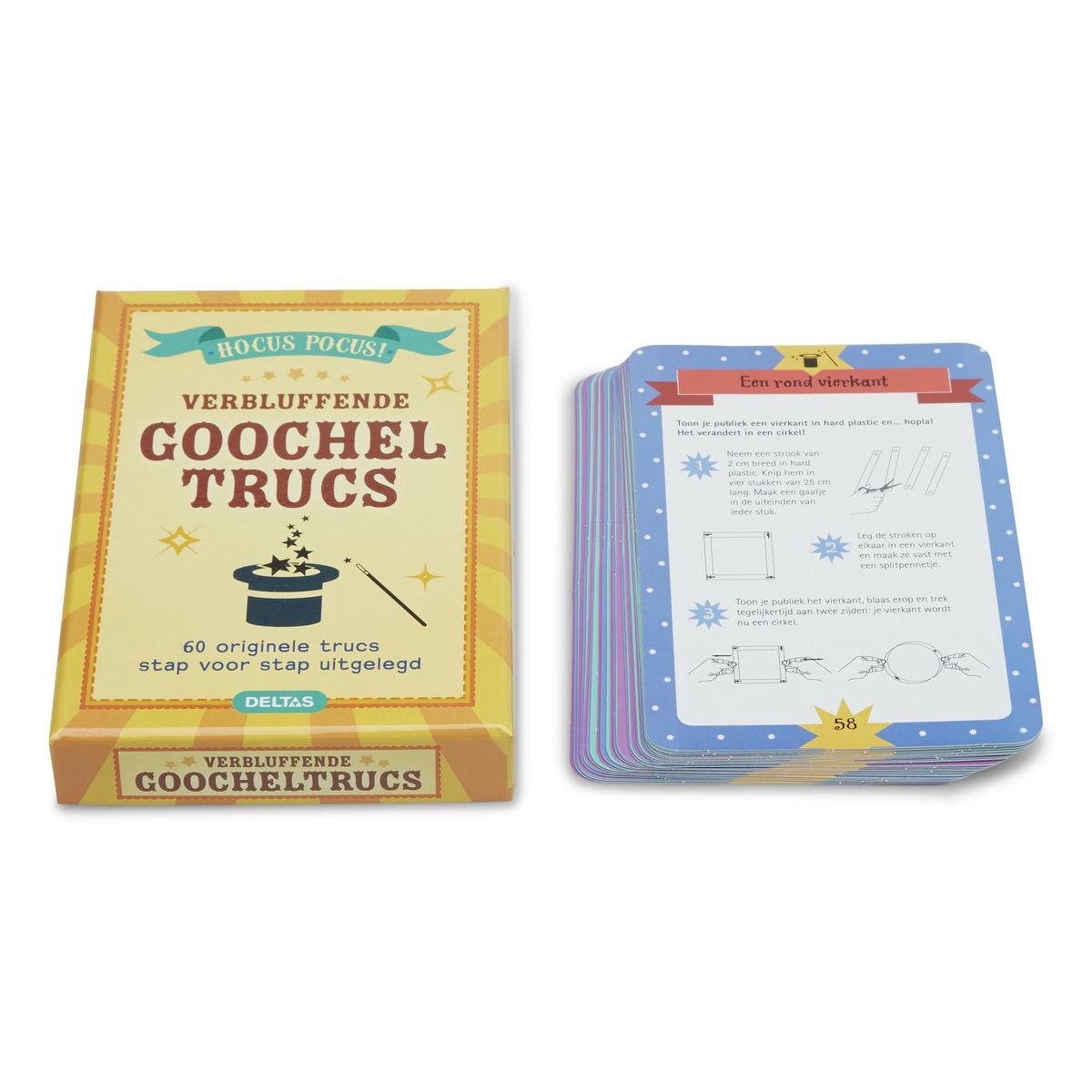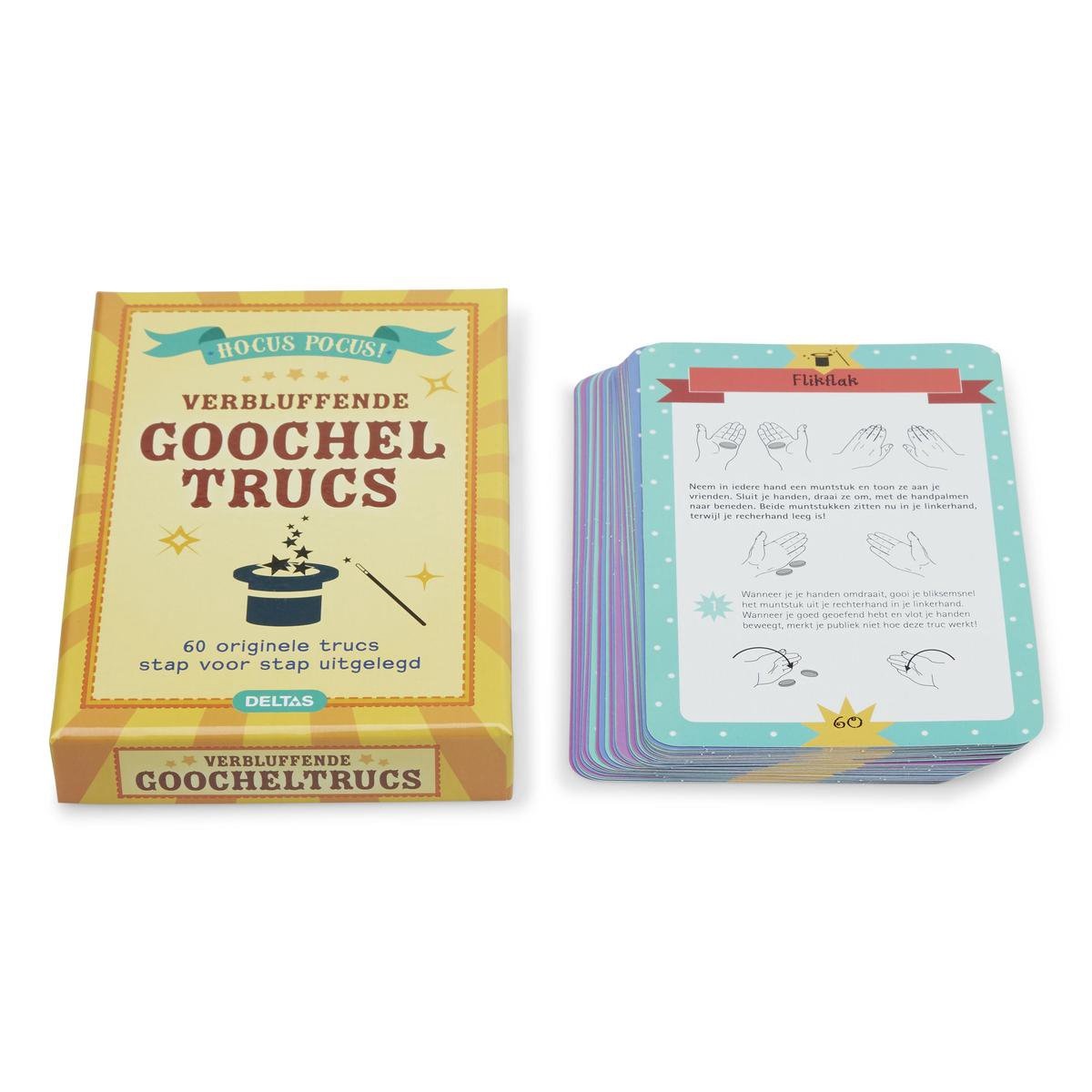60 originele trucs stap voor stap uitgelegd. Wil je een echte goochelaar worden en je vrienden en familie verrassen met je goochelkunst? Dan zijn deze kaarten echt iets voor jou. Ze bevatten 60 leuke en originele goocheltrucs die elke toeschouwer versteld zullen doen staan. Alle trucs worden stap voor stap en met duidelijke illustraties uitgelegd. Zo leer je gemakkelijk alle goochelgeheimen en ken je met wat oefening al snel de kneepjes van het vak!