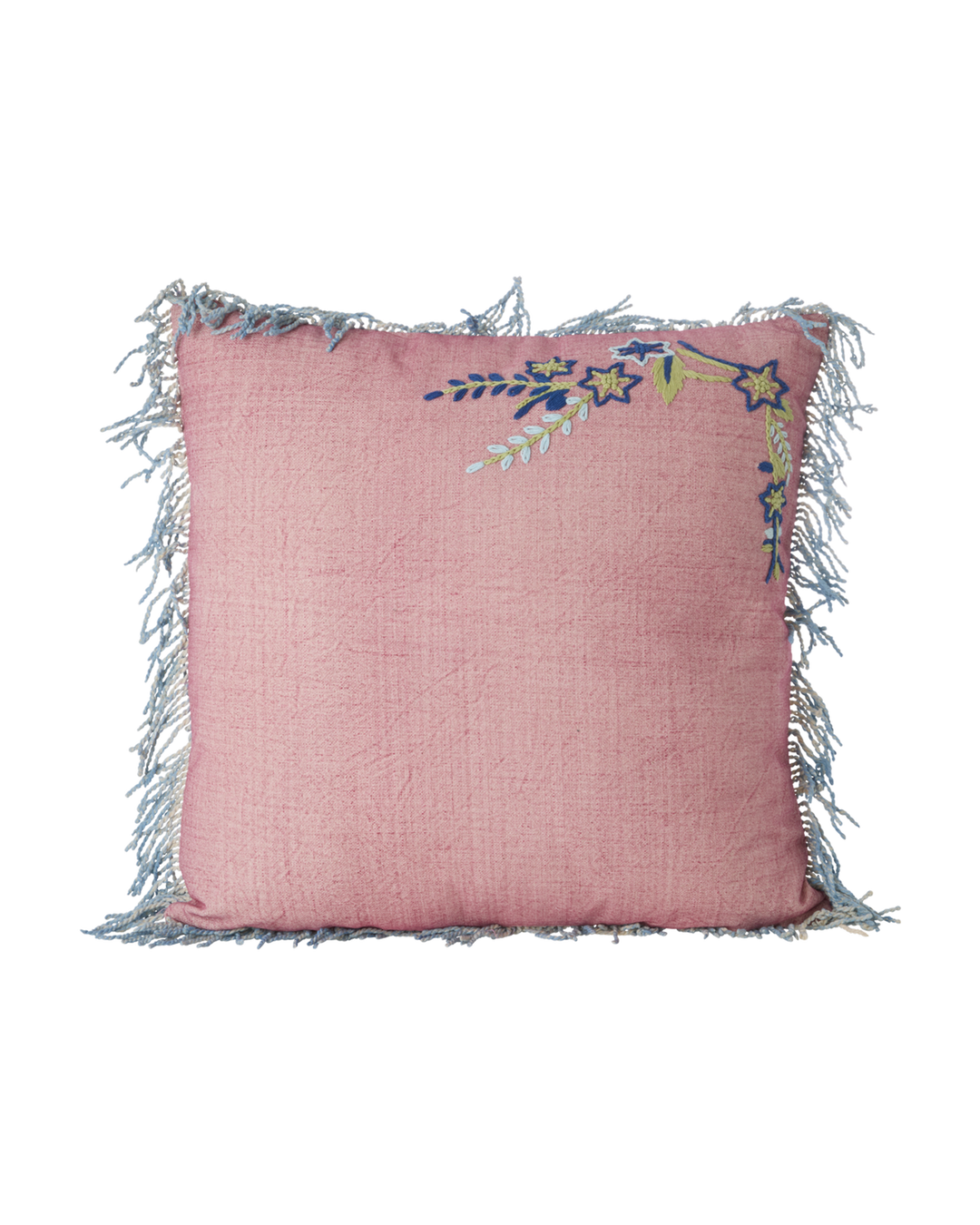 Prachtig, koraalkleurig kussen van katoen met blauwe franjes en een mooi bloemenborduursel. Leg het op het terras of gewoon op de bank in de woonkamer voor een vleugje alledaagse magie. Een kleurrijk kussen als dit creëert een heerlijke sfeer.