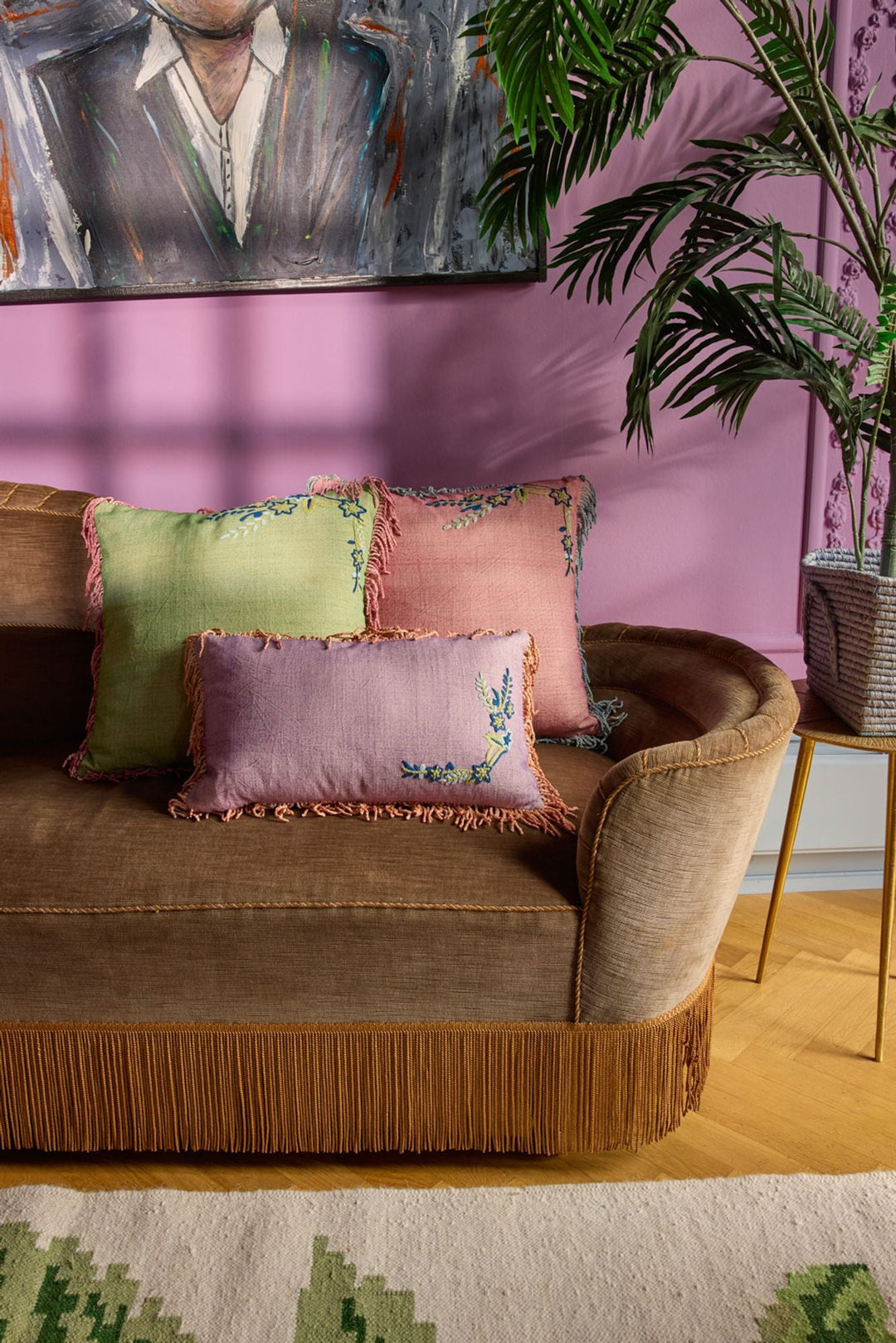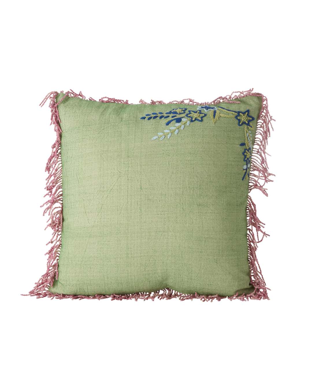 Prachtig, zacht groen kussen van katoen met roze franjes en een lieflijk bloemenborduursel. Leg het op het terras of gewoon op de bank in de woonkamer voor een vleugje alledaagse magie. Een kleurrijk kussen als dit creëert een heerlijke sfeer.