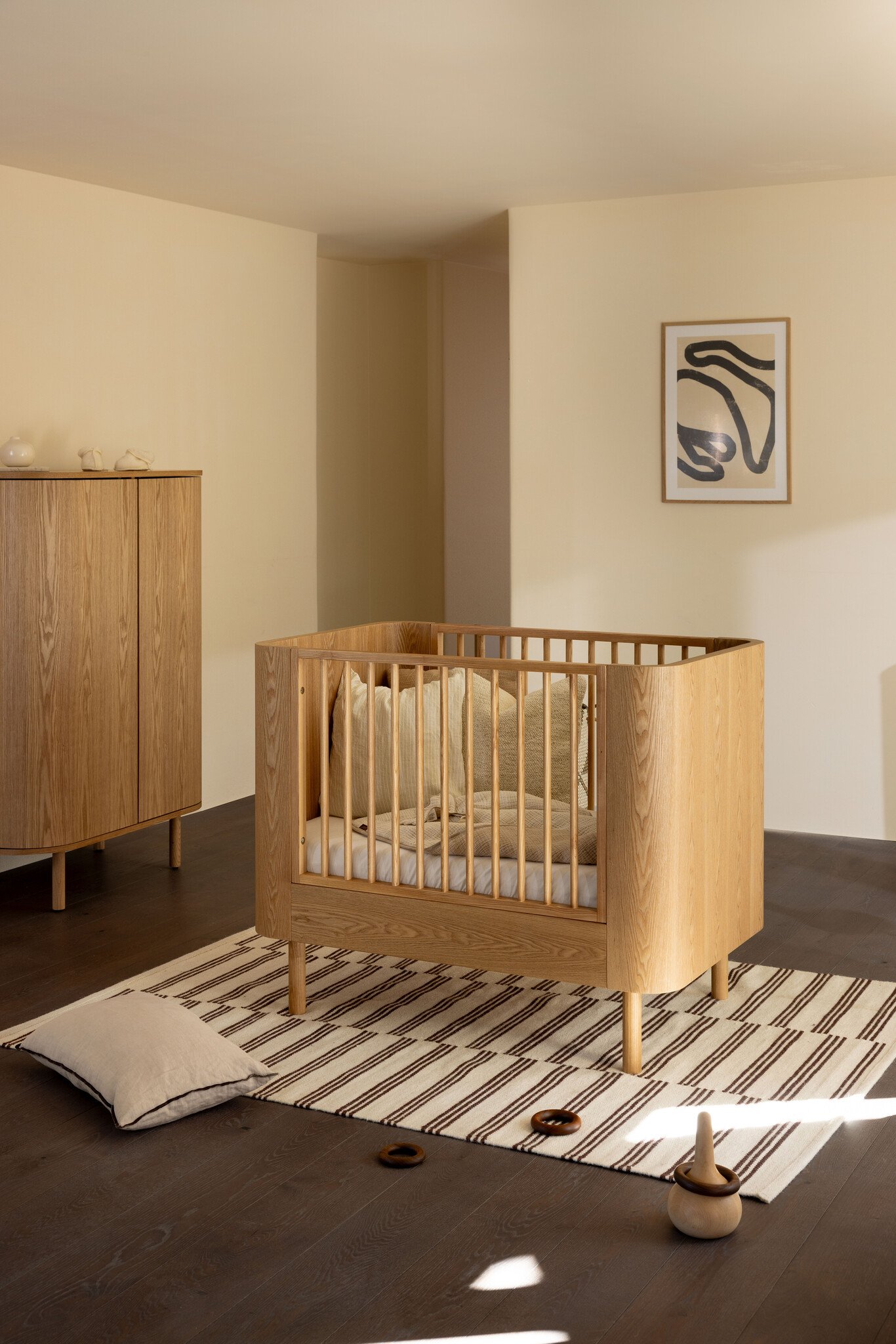 Het Quax Yume meegroeibed is een stijlvol en duurzaam rustpunt voor de babykamer. Dit bedje, uitgevoerd in de kleur Natural Ash, combineert de warme uitstraling van essenhout met een modern, tijdloos design. Dankzij de kenmerkende ronde vormen en verfijnde afwerking past het bed naadloos in de volledige Yume kamercollectie of bij de items uit de Hai No Ki serie.