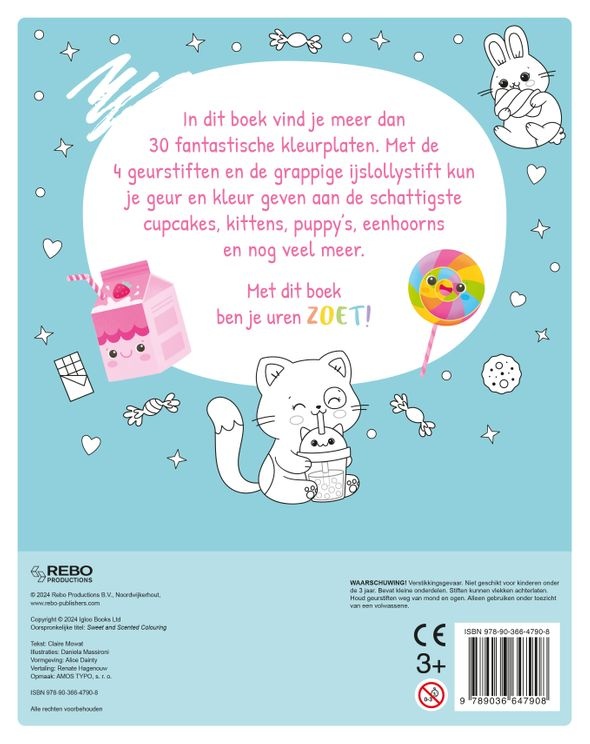 In dit boek vind je meer dan 30 fantastische kleurplaten. Met de 4 geurstiften en de grappige ijslollystift kun je geur en kleur geven aan de schattigste cupcakes, kittens, puppy's, eenhoorns en nog veel meer. Met dit boek ben je uren zoet!